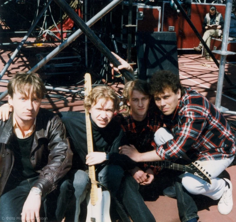 На фотографии: Сергей Богаев из группы «Облачный край» и группа «Новая земля» — Алексей Волынский — бас, Егор Антонюк — гитара, балалайка, Константин Стрелков.